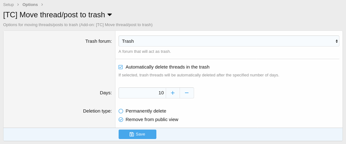 The add-on allows you to move threads and posts to a forum specified as trash using thread options or inline moderation.