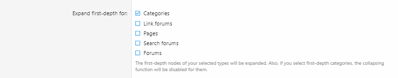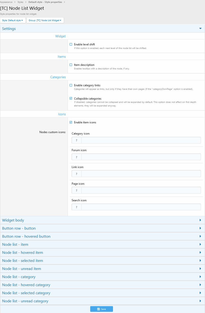 Style properties such as enabling the widget title (usually disabled), padding between levels (cascades), displaying node descriptions (if any), and displaying categories as links (if categories have their own pages)